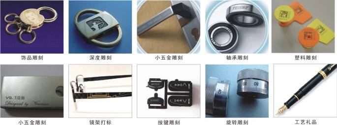 可雕刻標(biāo)記多種金屬及多種非金屬材料。可在不銹鋼板等高反光材料上標(biāo)記彩色圖案。特別適合應(yīng)用于一些要求精細(xì)、精度高的加工場(chǎng)合。應(yīng)用于電子元器件、集成電路(IC)、標(biāo)識(shí)標(biāo)牌、電工、電器、手機(jī)通訊、精密器械、眼鏡鐘表、首飾飾品、五金制品、工具配件、汽車配件、塑膠按鍵、建材、PVC管材、醫(yī)療器械等行業(yè)。 普通金屬及合金(銅、鐵、鋁、鎂、鋅等所有金屬),稀有金屬及合金(金、銀、鈦),金屬氧化物,特殊表面處理品(電鍍表面、鋁陽(yáng)極化、磷化),ABS料(電器用品外殼,日用品),油墨(透光按鍵、印刷制品),環(huán)氧樹(shù)脂(電子元件的封裝、絕緣層)。